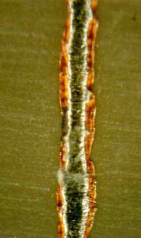 ![]() Fast durchgätzte Leiterbahn mit unregelmäßigen nicht maßbeständigen Rändern bedingt durch eine zu lange Belichtung des Fotoresist-Laminats mit UV-Licht. Galvanisch verzinnte Leiterbahn auf Epoxy-Glashartgewebe FR4 1,5 mm Stärke, 18 µm Cu und 10 µm Zinn. |